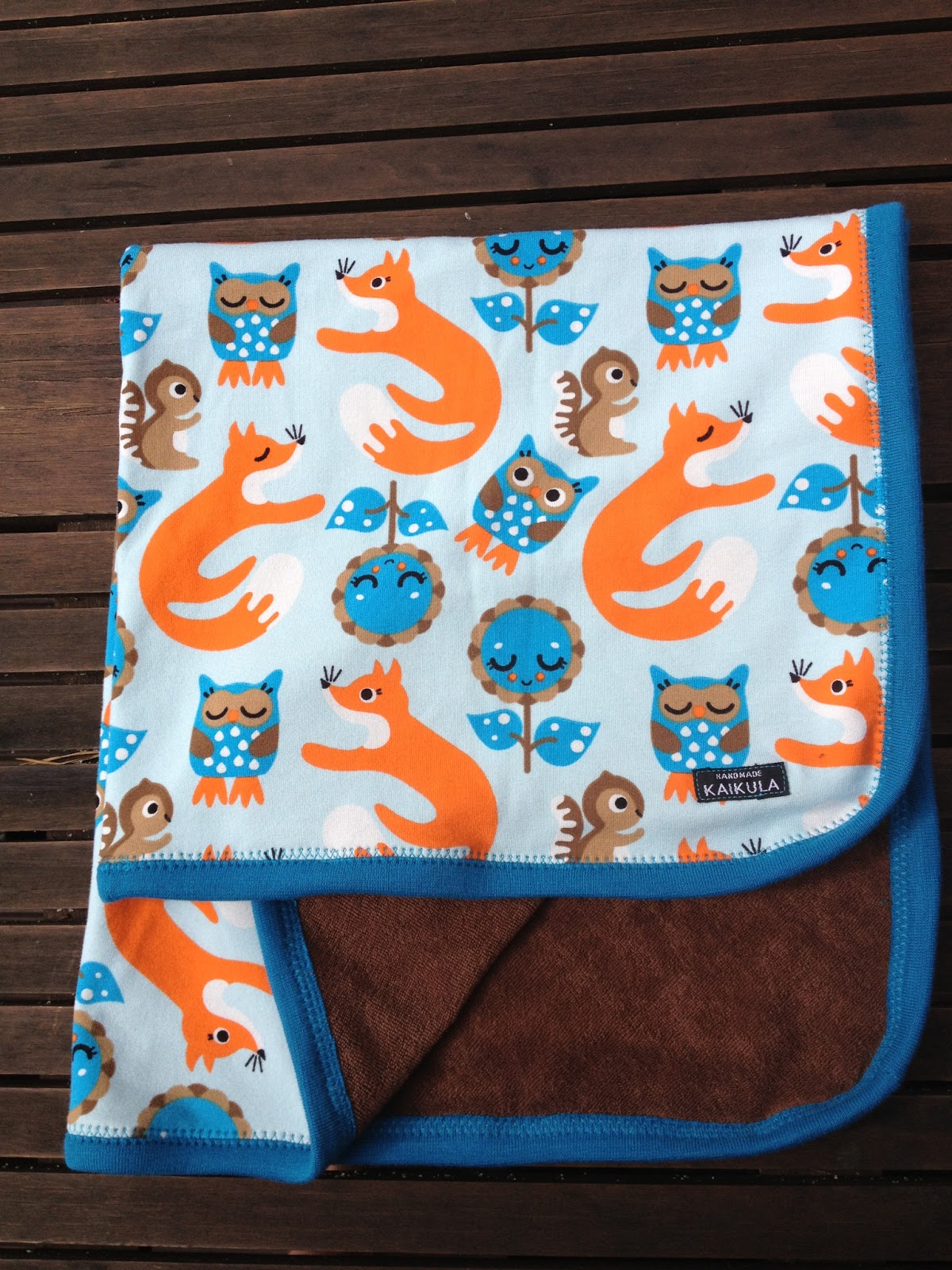 Pikkuiselle olen ommellut jo jotain pientä. Trikoopeiton ompelin ihanaisesta kettu-kankaasta ja sen taustana on Metsolan ruskeaa joustofroteeta. Kaksi pientä haalaria syntyi Ottobren little dumbo-kaavalla.